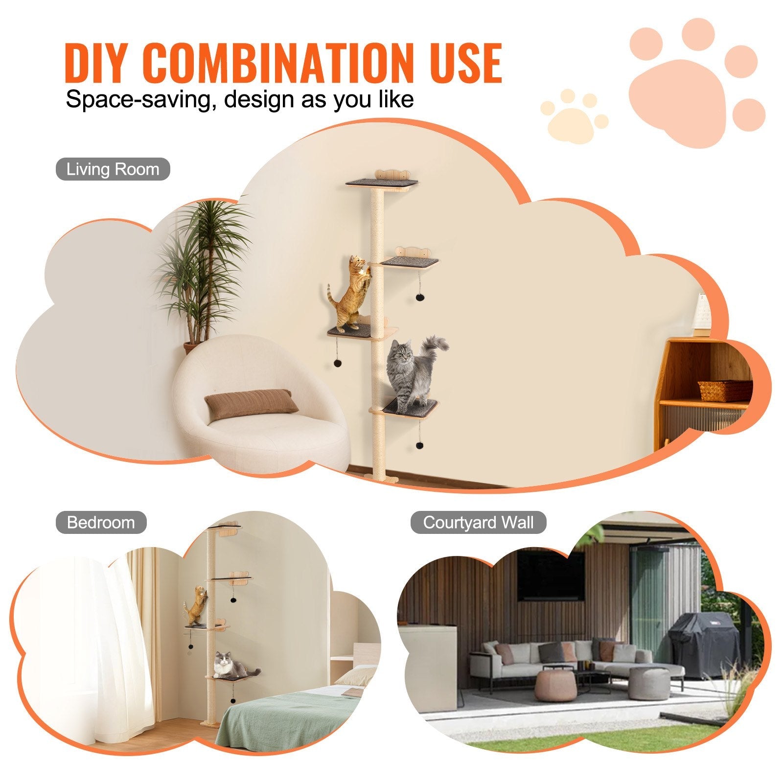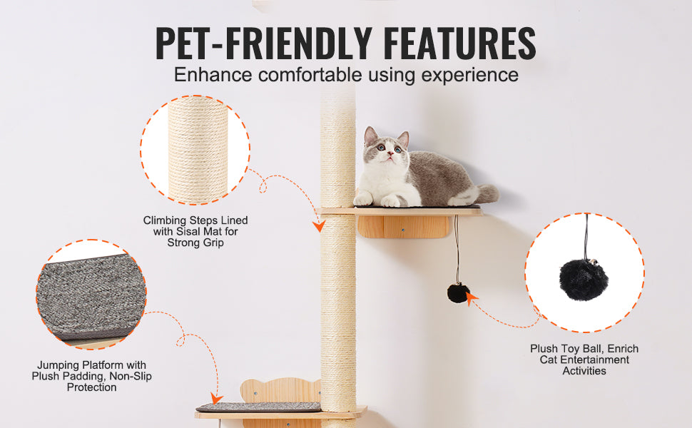 Detta mångsidiga klösträd kan arrangeras fritt för att passa olika utrymmen och preferenser. Med sin minimalistiska och stiliga design sparar den väggmonterade installationen golvyta och smälter perfekt in i din heminredning, vare sig den är installerad i vardagsrummet, sovrummet eller på uteplatsen.