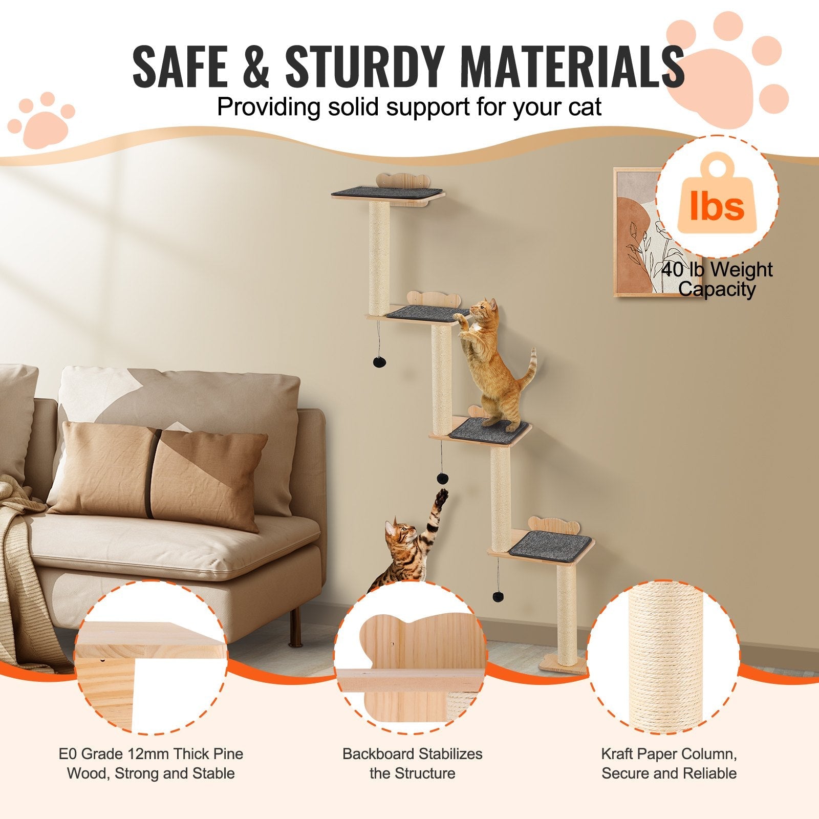 Tillverkad av högkvalitativt furu av E0-grad, är denna väggmonterade katthylla både robust och hållbar, med en viktkapacitet på upp till 18 kg. Det naturliga tallträet är giftfritt och luktfritt, vilket gör det säkert för katter att klättra och leka. Plattformarnas ytor är täckta med plyschdynor för halkskydd och mjukhet, vilket skyddar din katts tassar.