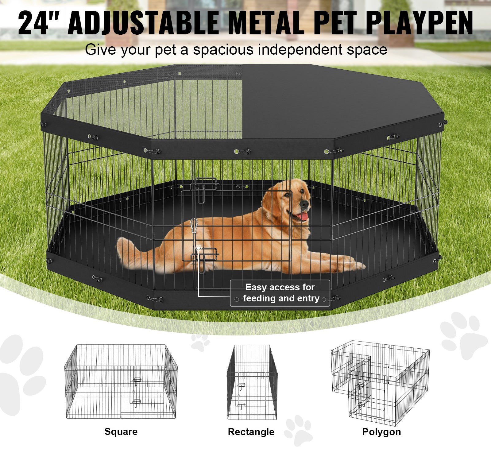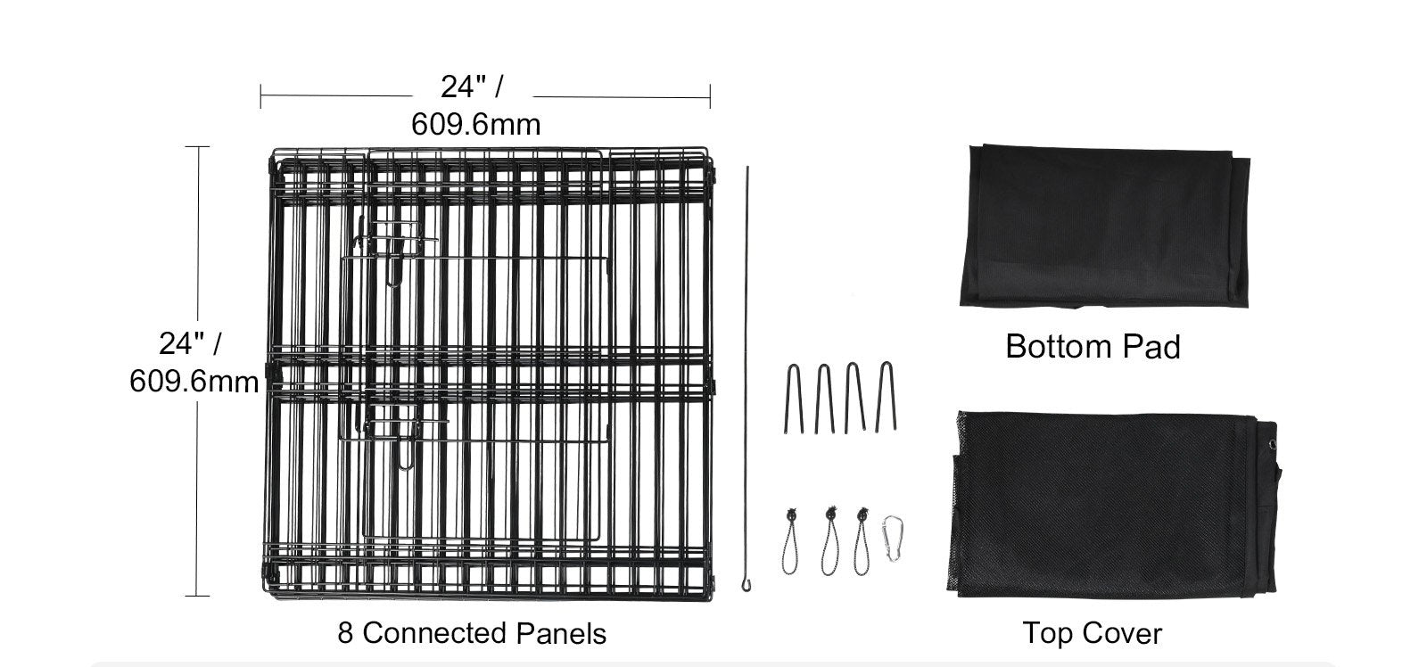 Denna lekhage garanterar säkerhet med flera låsdesigner. Den har 8 stycken markpinnar, 2 grindspärrar, 16 spännband och 1 karbinlås för att förhindra att husdjur öppnar grinden eller hoppar ut. Den robusta metallen hindrar husdjur från att välta den eller tugga igenom den.